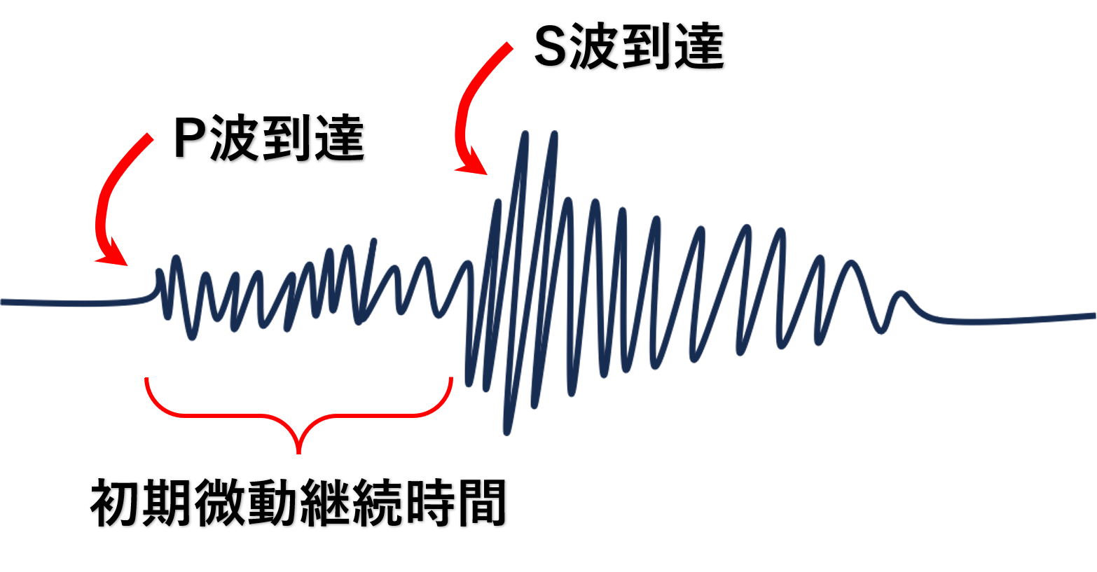 P波の方が速度が早くS波の方が速度が遅くなっています。速さが違うということは届くまでの時間が違いますよね?この時間の差のことを初期微動継続時間といいます。