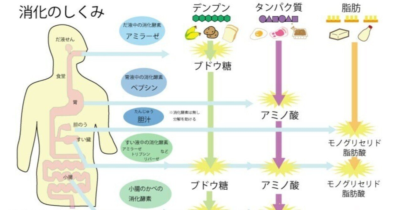 「デンプン・タンパク質・脂肪」は、それぞれどの器官で、どの酵素によって分解されるでしょう?